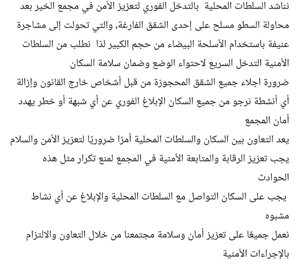 وتجدر الإشارة إلى أن المتضررون يناشدون الجهات المعنية لإتخاذ الإجراءات اللازمة لحمايتهم ووضع حد لأي أنشطة مشبوهة داخل المجمع إلى جانب تكثيف الدوريات الأمنية بصفة مستمرة، ليلا ونهارا.